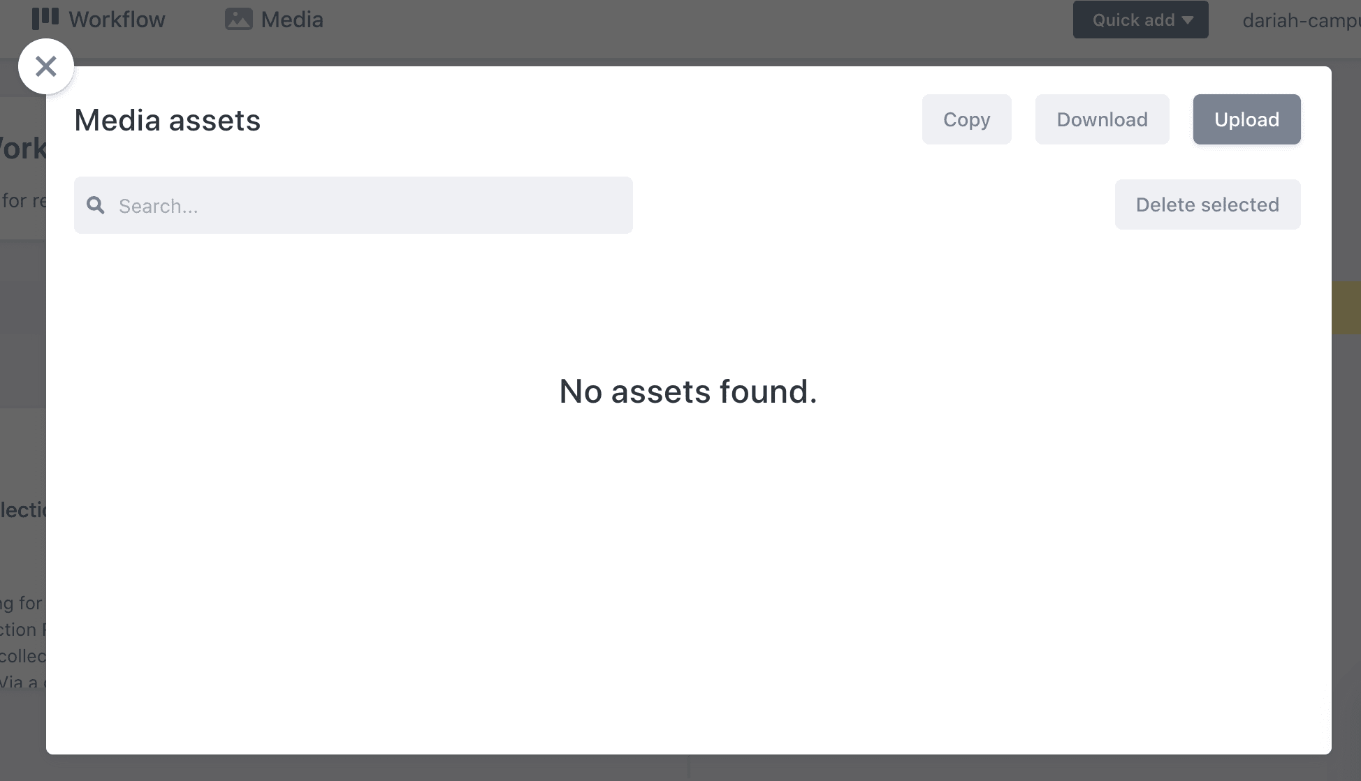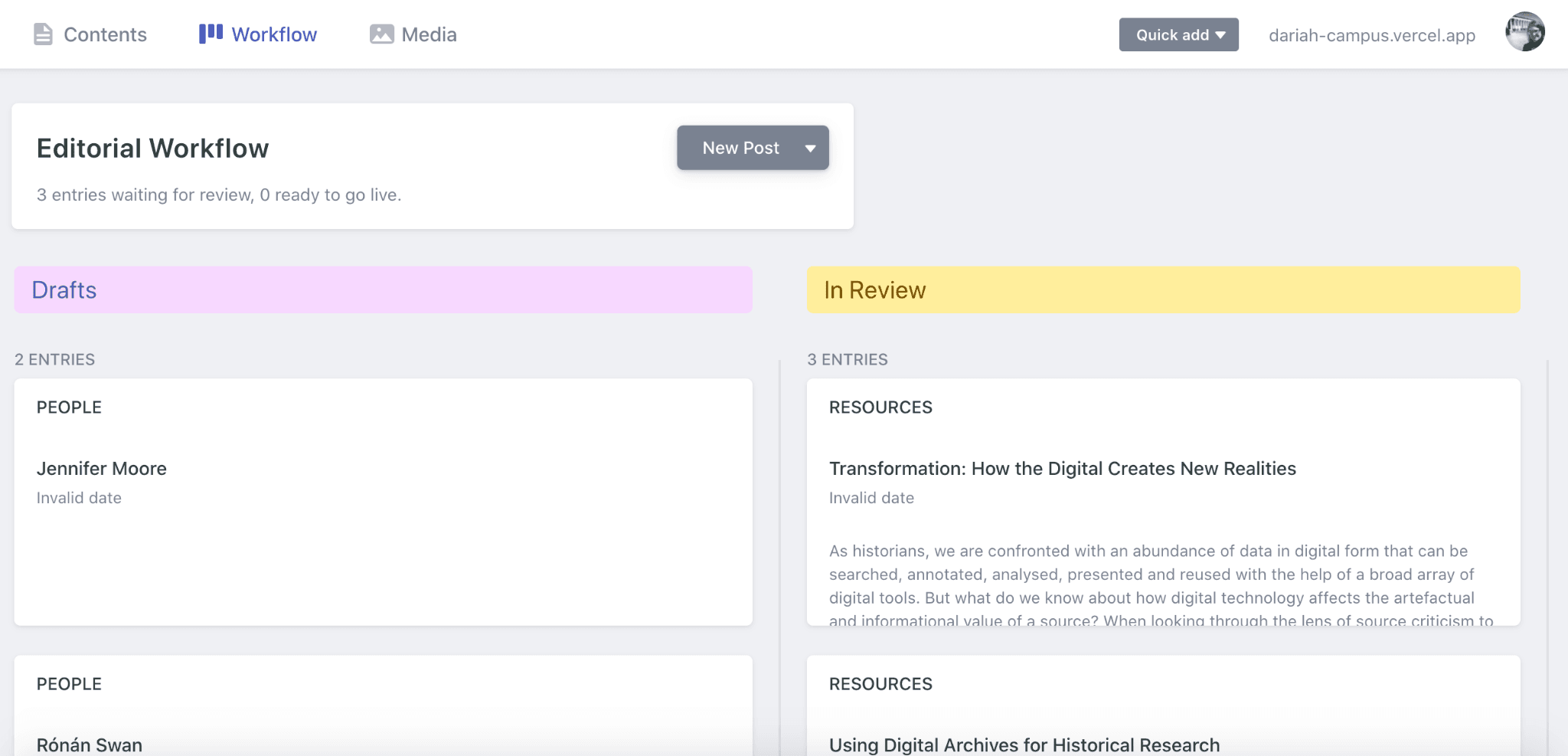 Along the top you will see three main menu items: ‘Contents’, ‘Workflow’ and ‘Media’.
