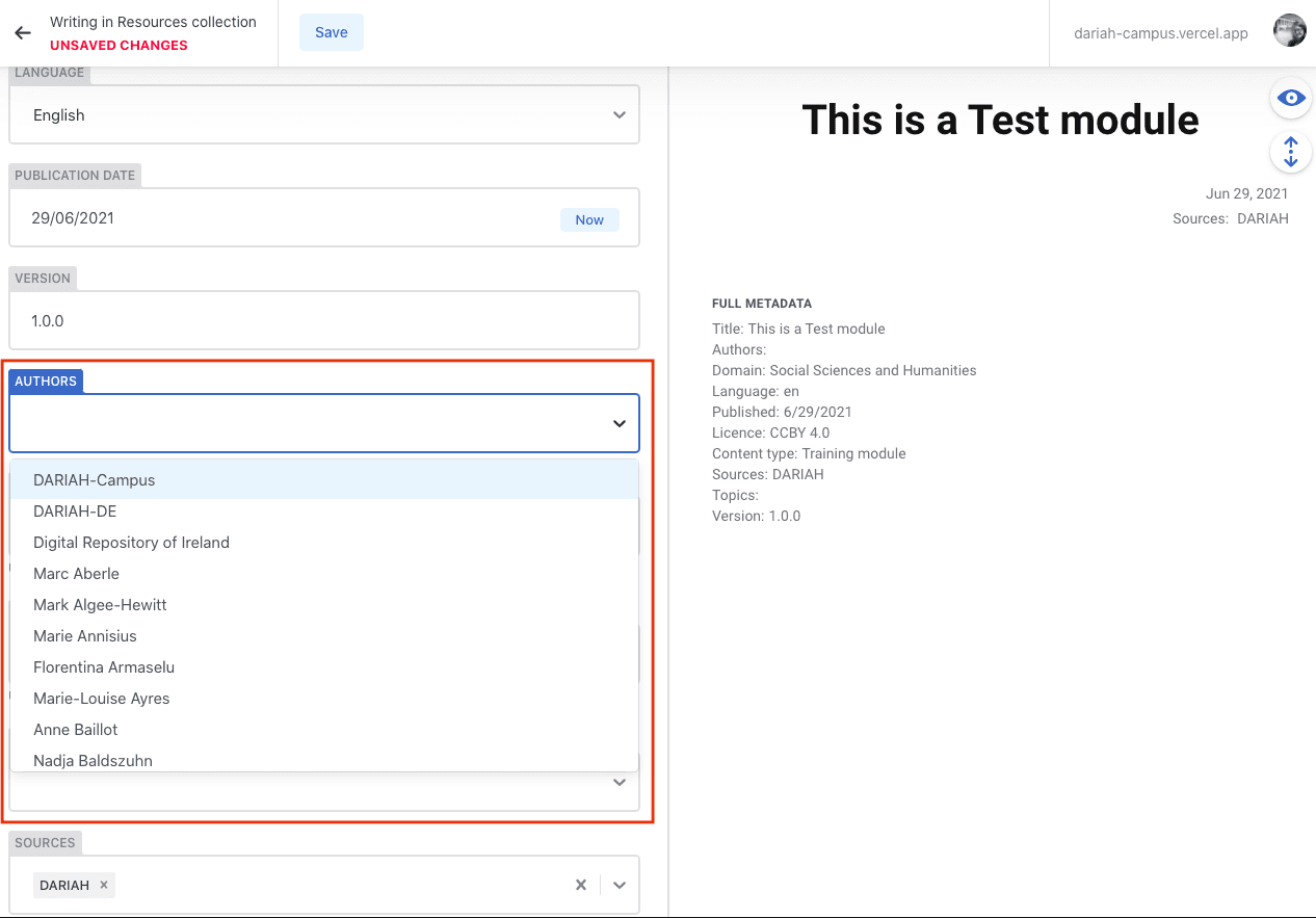 - ‘Sources’ are by default listed as ‘DARIAH’. If you think that you are going to have a large number of resources added to DARIAH-Campus, then you can speak to us about setting up a channel within the ‘Sources’. However, if this is among the first of the resources you will be submitting, we ask you to leave this as ‘DARIAH’ for now, and we can discuss the option of adding a dedicated source for you. Resources can then be switched over to your source channel retrospectively.