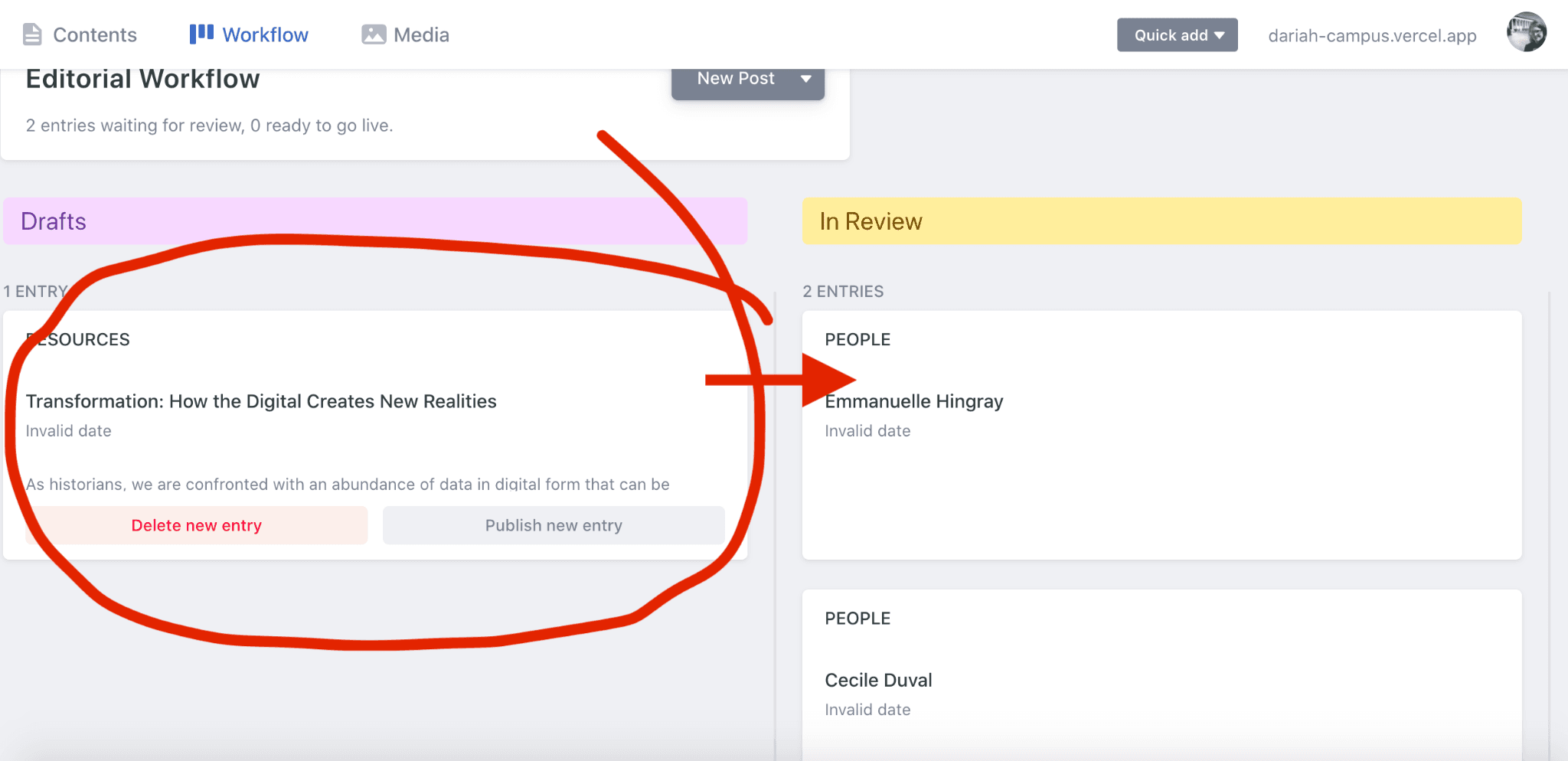 The ‘Workflow’ page shows you what you have saved as a draft (in the left-hand column), and what you have sent for publication that is waiting to be approved by the administrators (on the right-hand side). More on this later.