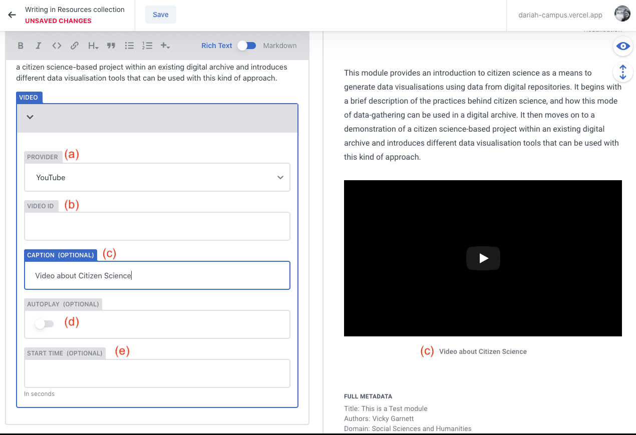The ‘Video’ option is a bit different to the ‘Video Card’ option as it allows you to embed a video within the content of the resource you are writing. This is particularly useful if you are creating a new ‘Hosted’ resource directly on DARIAH-Campus, and want to embed a video to illustrate or demonstrate an issue or provocation.