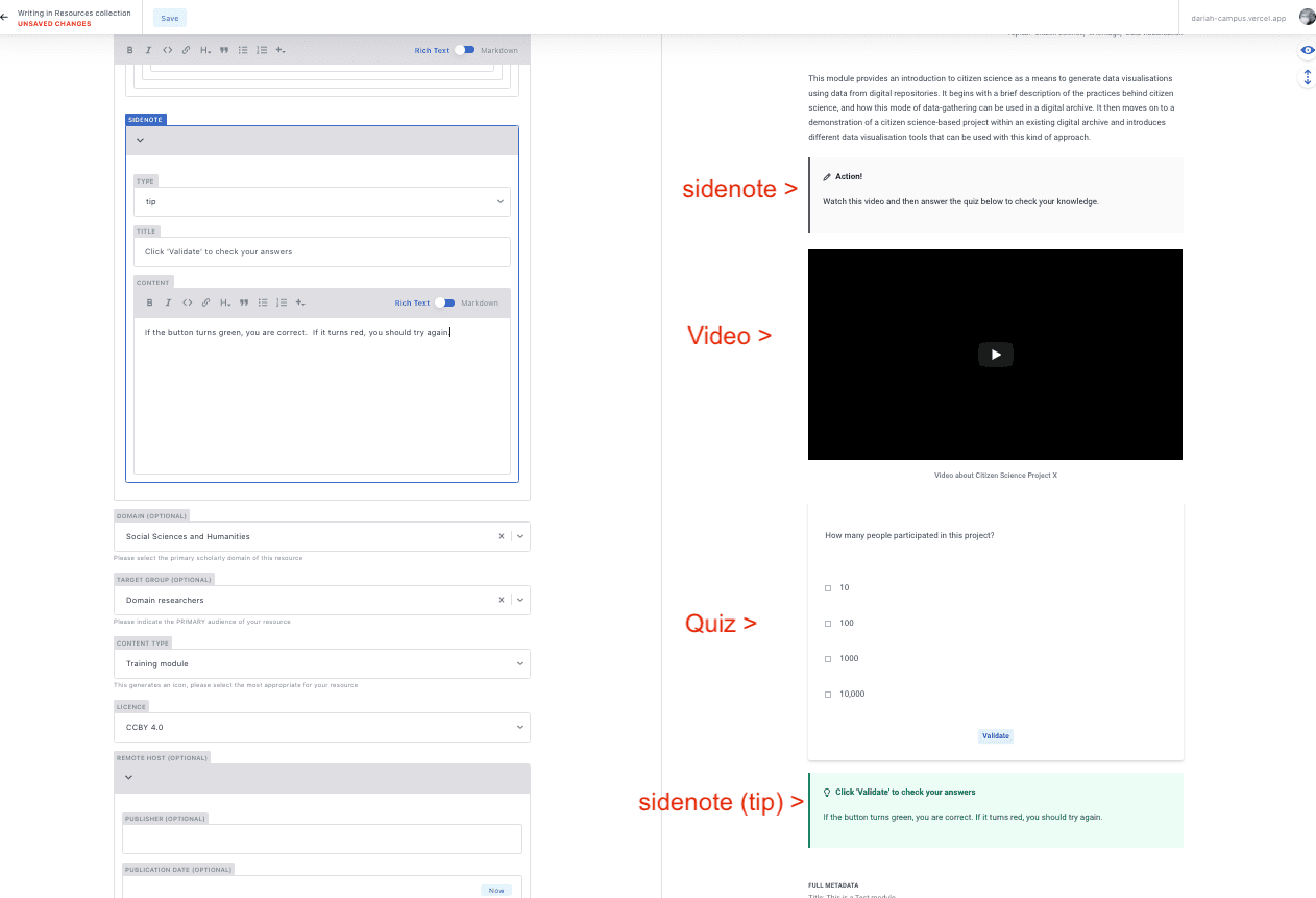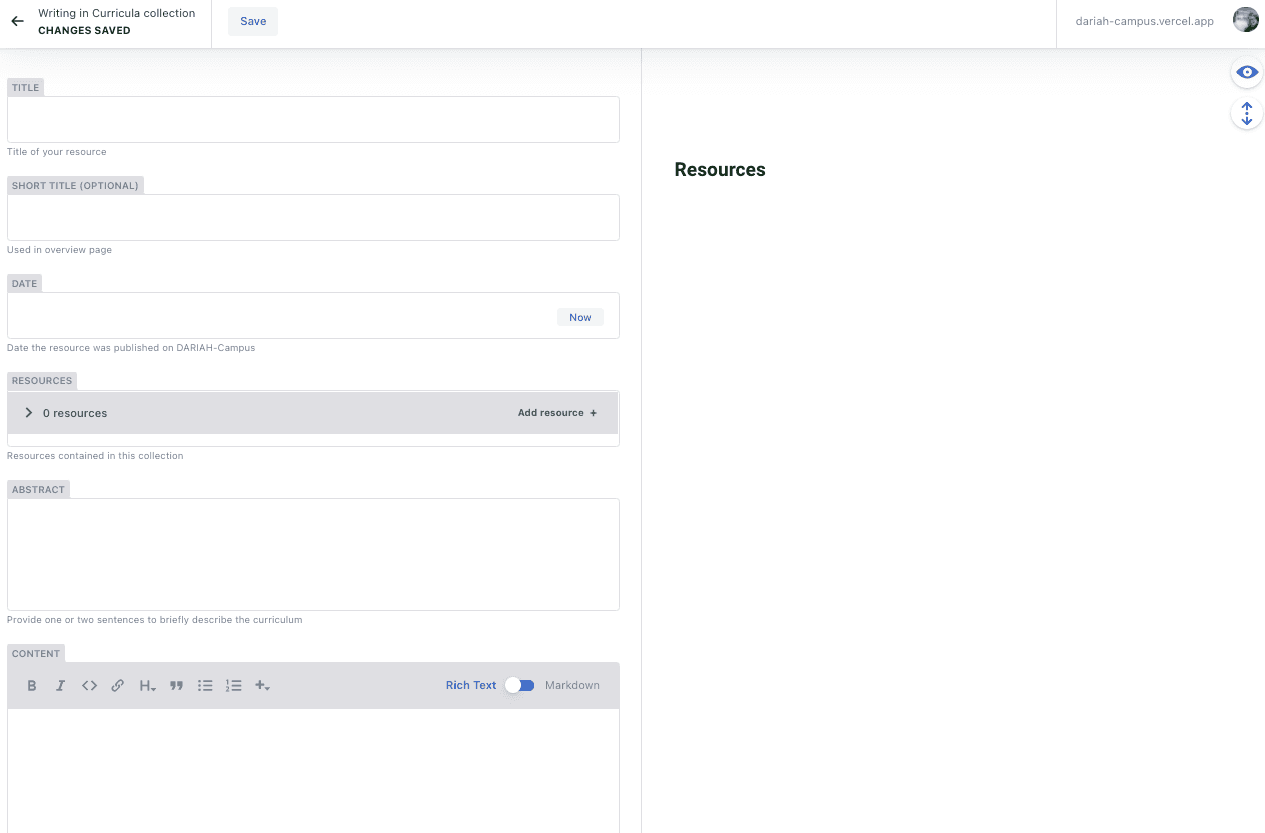 - This will bring you to a page with a form with two columns: a form on the left hand side, and a preview panel on the right. As you add items, you will see that the preview panel will start to display them so you can see how they will show up on the main DARIAH-Campus site.