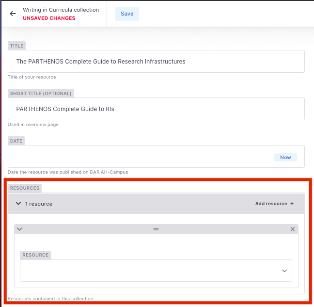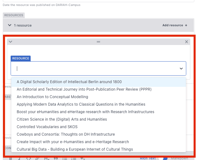 The Resources you want to include in your Curriculum can be selected from the existing list of published materials on DARIAH-Campus.